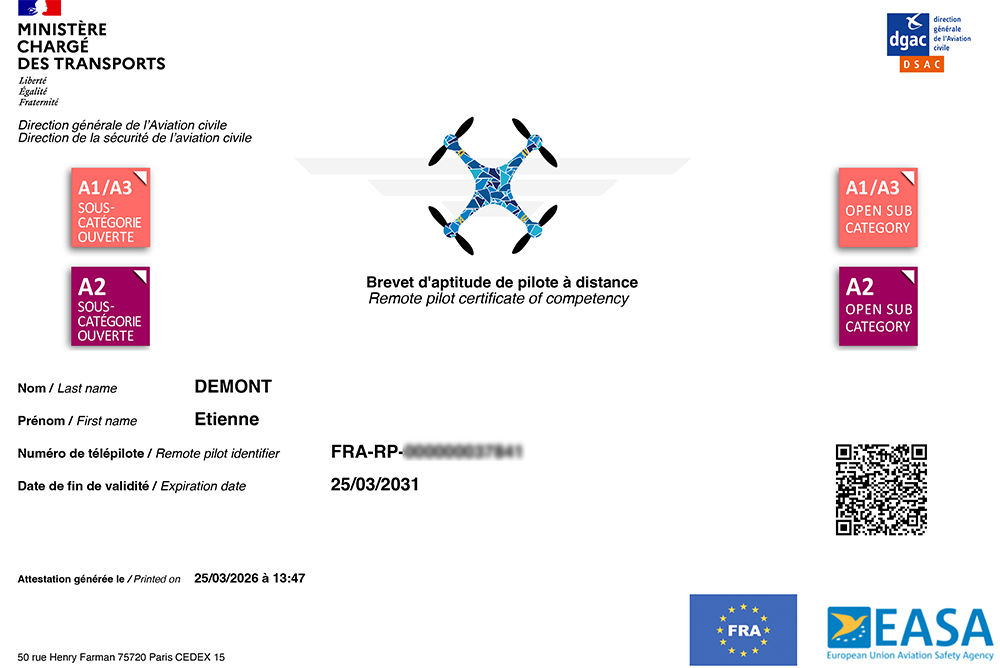Nous avons obtenu le certificat d’aptitude théorique et pratique de télépilote CATS STS-01 / STS-02 / OPEN A1 A2 A3, afin d’évoluer avec les nouvelles normes imposées par l’union €uropéenne, par la DGAC et par l’EASA pour l’usage des drones en scénarii spécifiques tels que le STS-01 (agglo) / STS-02 (hors agglo 1 à 2Km maxi) / Open A1, A2 & A3.